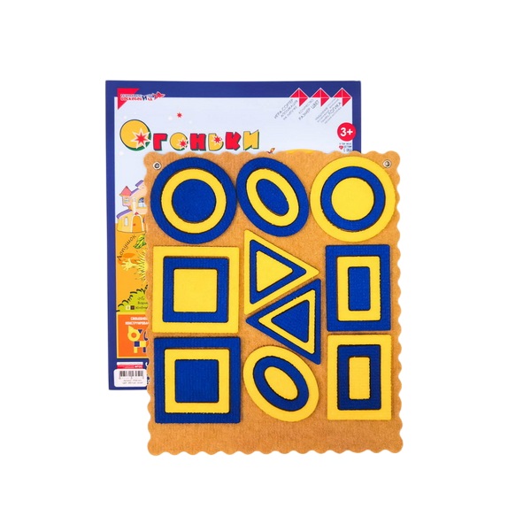 Описание: "Огоньки" - игра, элементы которой держатся на игровом поле за счет крепления "липучка", их можно перемещать, накладывать друг на друга и, таким образом, конструировать, создавать сюжетные картинки, придумывать логические задания. Собирая фонарики, "зажигая" в них огоньки, ребёнок знакомится с геометрическими фигурами, формой, цветом (жёлтый, синий), размером.