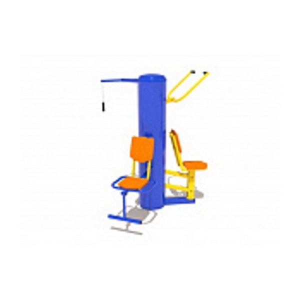 Назначение: укрепление мышц рук, ног и спины. Тренажер расчитан на двух человек. Несущие стойки тренажера выполнены из металлической трубы профильной 40х60мм, 40х40мм, 40х20мм сверху стойки и механизмы закрыты цилиндрической стойкой Ø 320 мм. Все шарнирные узлы имеют подшипники скольжения закрытого типа. Сидение и спинка изготовлены из ударопрочного и морозостойкого пластика. Все жесткие соединения выполнены при помощи электросварки. Металлические элементы окрашены порошковыми красками. Крепежные элементы и места срезов труб защищены пластиковыми заглушками. Стойка бетонируется в землю на 0,6м.