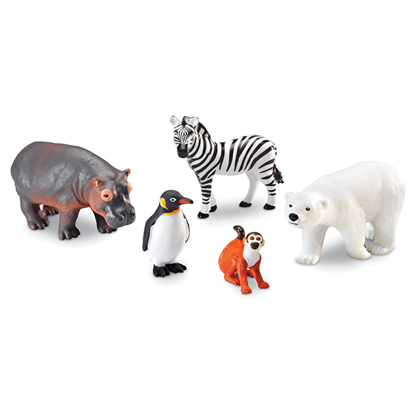 В набор входит 5 пластиковых фигурок: пингвин, белый медведь, зебра, обезьяна, зебра. Самая крупная фигурка в наборе - бегемот - имеет размеры 20х10 см.