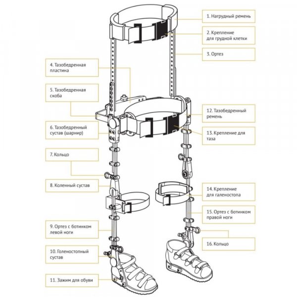 - Аппарат на нижние конечности и туловище (ортез) тренирует навыки самостоятельной ходьбы за счет фиксации суставов в физиологическом положении. В результате формируется правильный стереотип движения и предотвращается патологическая установка стоп и голеней.