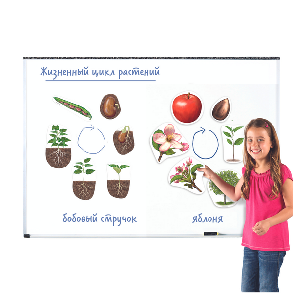 В состав набора входят магниты двух растений: яблони и бобовых. Магниты имеют поверхность «пиши и стирай», что позволяет использовать их многократно. Дети могут рисовать на поверхности маркером сухого или влажного стирания, а затем легко стирать любые надписи влажной салфеткой.
