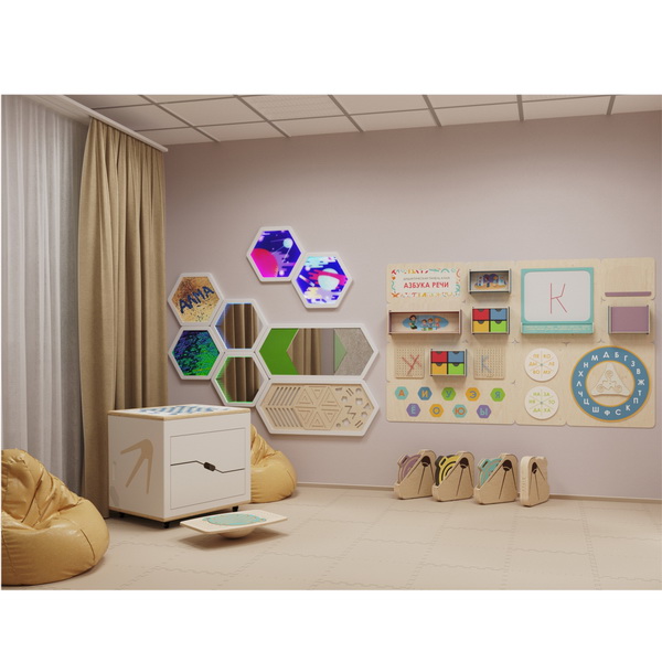 Готовое решение по оснащению кабинета логопеда в ДОУ. Содержит всё необходимое современное оборудование для эффективной работы детского специалиста: стол логопеда с компьютером, рабочий стол для детей, интерактивную панель с профильным ПО для логопедов «Звукоречье», дидактическую панель «Азбука речи», набор корпусной и мягкой мебели, безопасные зеркала, нейротренажеры, методические материалы и пособия.