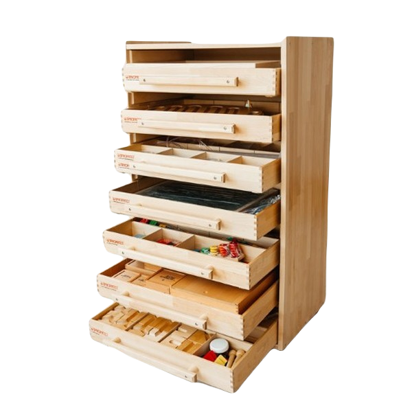 При изготовлении использовались только качественные материалы: натуральная древесина, краски без токсичных компонентов. Все детали отличаются безопасностью. У них нет острых углов и граней. Размер достаточно крупный, а поверхность тщательно отшлифована. Удобная система хранения: мобильная тумба на поворотных колесах и выдвижные ящики для каждого модуля.