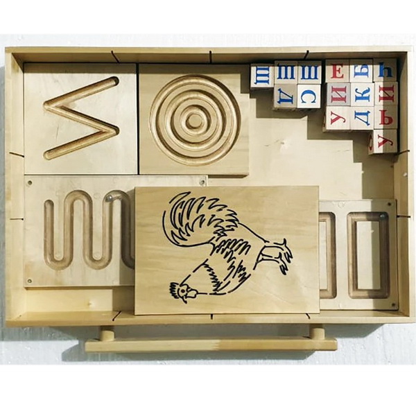 Тема модуля – письмо. Комплект направлен на активное разрабатывание кистей и пальцев рук. Во время занятий с панелями укрепляются мышцы рук, улучшается координация движений. Ребенок учится делать плавные движения кистями, после чего заметно улучшается почерк. С помощью кубиков можно изучать алфавит и составлять слова.
