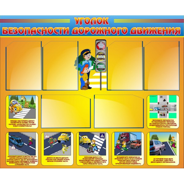 Стенд содержит правила безопасного поведения на дороге и занимательные картинки к ним. Также он снабжен 6 прозрачными карманами формата А4, которые воспитатели могут заполнить своими разработками.