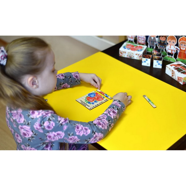 Дидактический набор состоит из 12 плашек с изображением русской народной росписи. Каждая плашка разделена на 10 частей. В состав набора входит наглядный материал для сборки плашки.