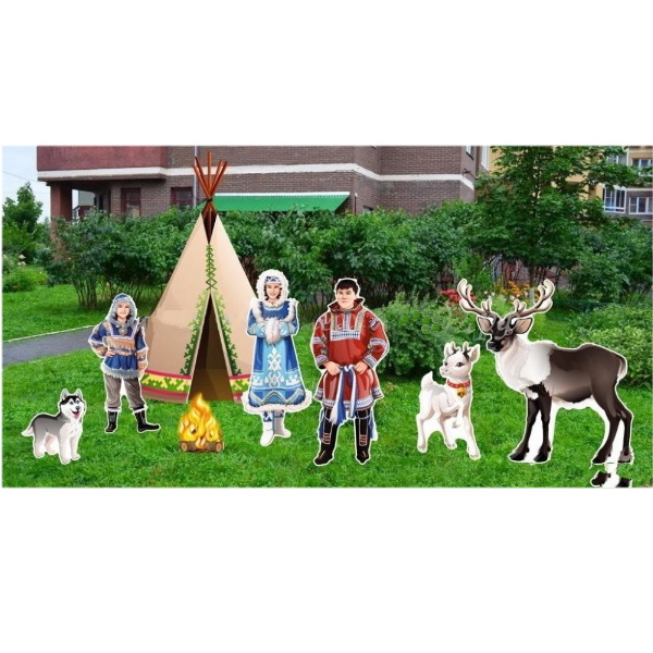 Композиция уличных фигур "Хантыйское стойбище" состоит из семи отдельностоящих фигур: семьи хантов, хаски, двух северных оленей, костра и объемного чума. Фигуры выполнены из ПВХ с нанесением полноцветного рисунка, покрытого защитной пленкой. Объемный чум состоит из металлического каркаса, обтянутого баннерной тканью окрашенной в цвет шкуры с нанесенным этническим узором. Используемые материалы безопасны и устойчивы к атмосферным воздействиям, а конструкция гарантирует долговременное использование.