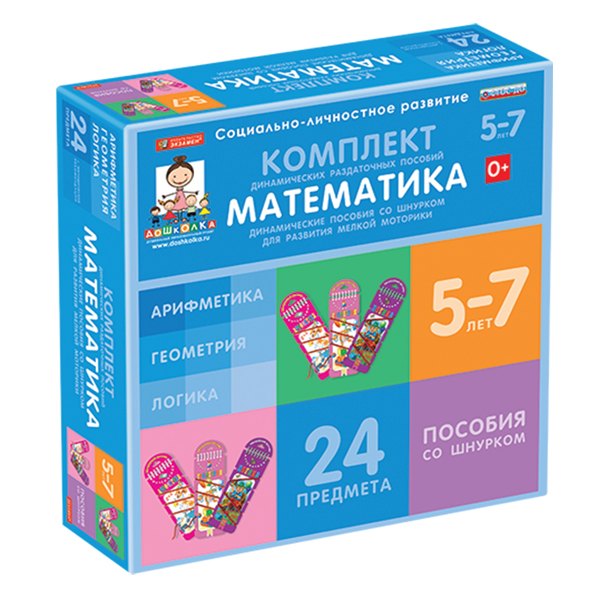 Комплект включает три содержательных блока с заданиями по арифметике, геометрии, логике. Ответив на вопрос, ребенок протягивает шнурок через специальные выемки на карточке и затем проверяет правильность решения по рисунку на обратной стороне.