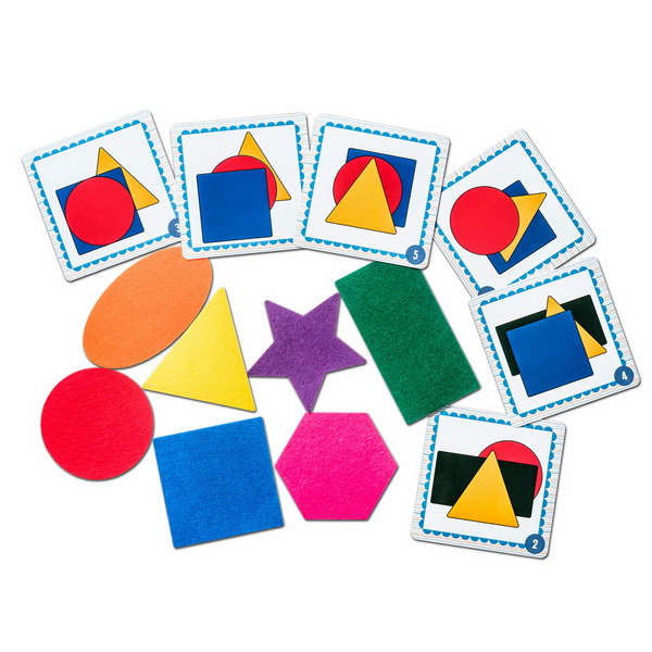 В наборе: 7 геометрических фигур из фетра и 6 ламинированных карточек.