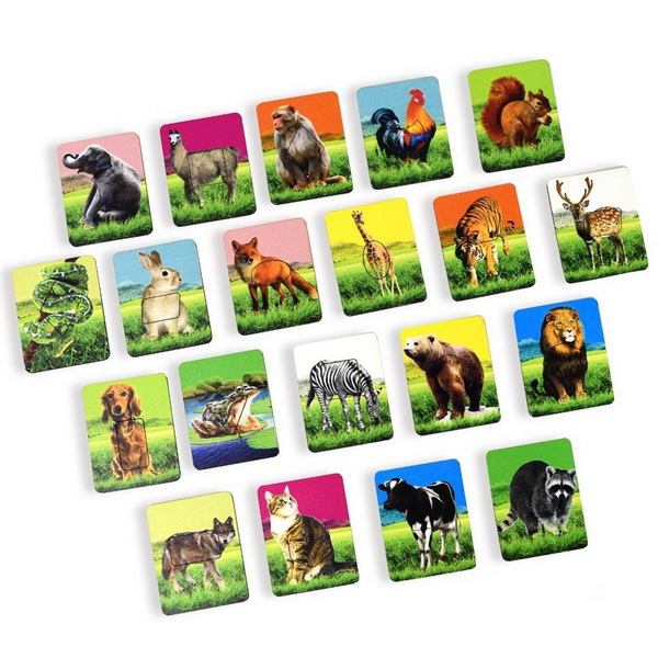 На пластинах изображены разные представители ЖИВОТНОГО МИРА: лягушка, жираф, зебра, тигр, лев, заяц, кот, собака, слон, змея, петух, пятнистый олень, лиса, медведь, обезьяна, волк, белка, корова, лама, енот.