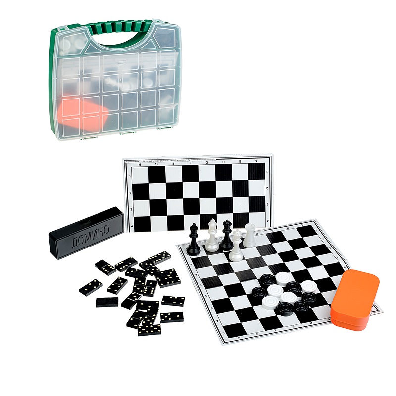 Набор из 3 игр "Походный-малый" в чемоданчике (шахматы обиходные пластик,домино, шашки + 2 доски)