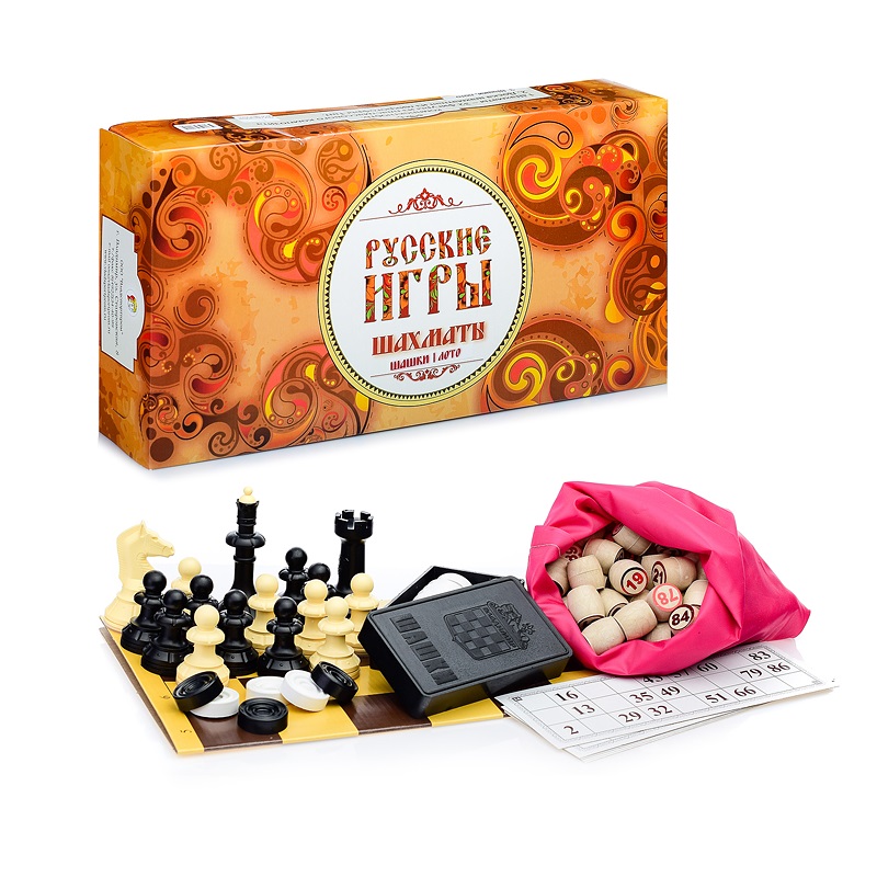 - В набор "Русские игры" входит: шахматы, шашки, лото (бочонок из древопласта), доска из микрогофры.