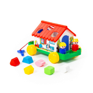 Игрушка 2 в 1 – каталка и сортер. Длина 25 см, высота 19 см. Диаметр колеса 4,5 см. На крыше есть прорези, в которые проталкиваются шесть формочек.
