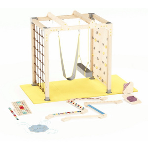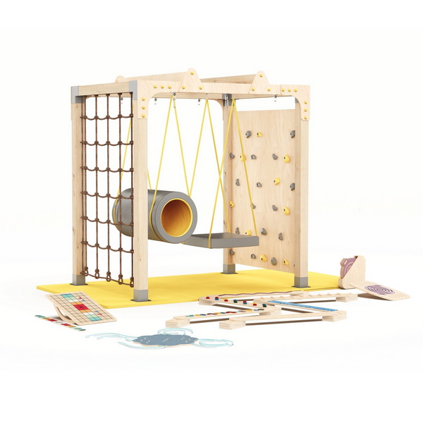 Спортивный комплекс представляет собой стационарную раму из бруса с комплектом навесного оборудования для решения разных моторных и сенсорных задач.