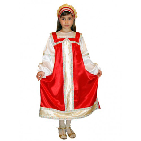 Костюм для девочки в русском народном стиле, состоит из белой рубашки с широкими рукавами и кружевными манжетами, ярко-красного сарафана, украшенного тесьмой по центру передней части, по подолу, а также кокошника.
