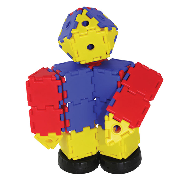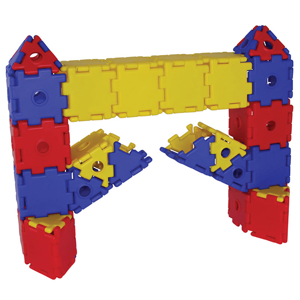 45 треугольников, 45 треугольников с отверстиями, 90 квадратов, 90 квадратов с отверстиями, 36 колец, 12 колёс, 18 осей, 18 детских фигурок и 18 фигурок взрослых.