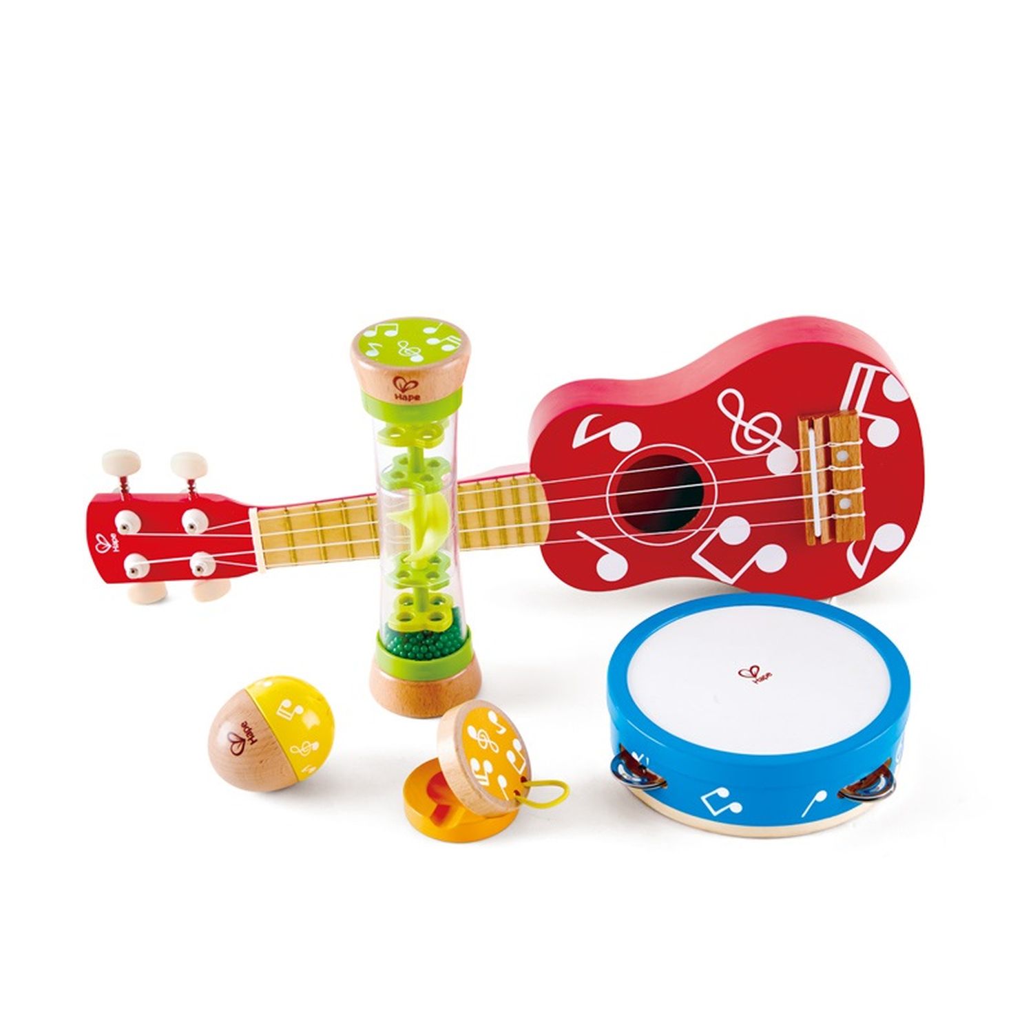 Набор состоит из пяти инструментов: гавайская гитара, бубен, трещотка, бисерный дождь, погремушка.