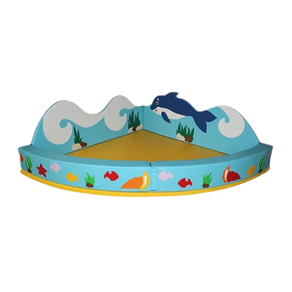 Сухой бассейн-трансформер» угловой с аппликацией (разборный) состоит из двух матов фигурной формы, бортика сектора окружности из 2-х частей на липе, мягкое дно 5 см. Размер: радиус 2,0 м. высота бортика 30 см., S-15 см. Высота настенных матов 70 см.
