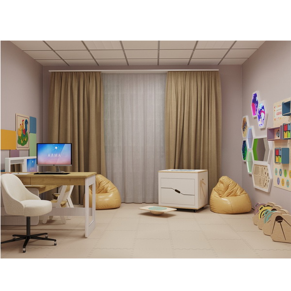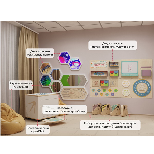 Готовое решение по оснащению кабинета логопеда в ДОУ. Содержит всё необходимое современное оборудование для эффективной работы детского специалиста: стол логопеда с компьютером, рабочий стол для детей, интерактивную панель с профильным ПО для логопедов «Звукоречье», дидактическую панель «Азбука речи», набор корпусной и мягкой мебели, безопасные зеркала, нейротренажеры, методические материалы и пособия.