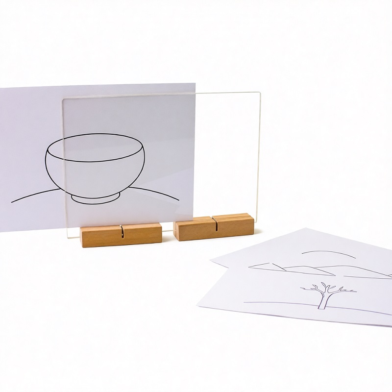 Рабочая поверхность мольберта изготовлена из акрилового стекла и вставляется в подставки из натурального бука. Подставки позволяют его использовать в вертикальном, горизонтальном положении, а также параллельно рабочей поверхности стола.