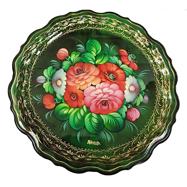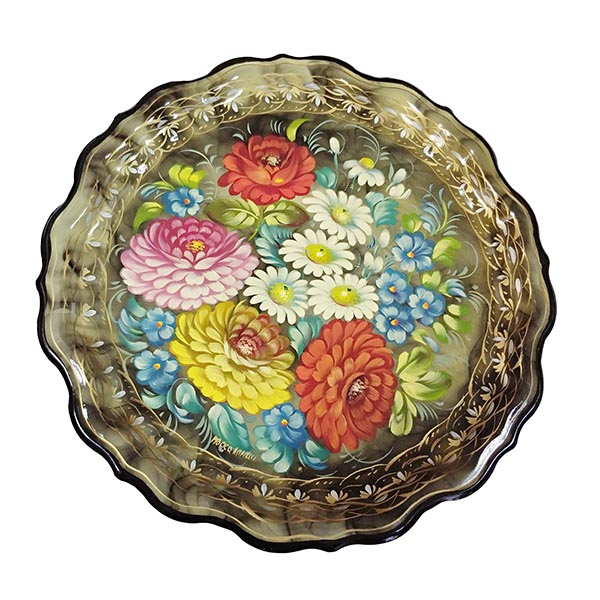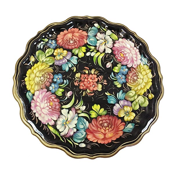 Жостовский поднос с изображением садовых цветов с классическим черным фоном.