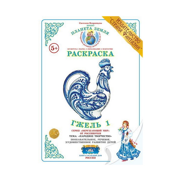 Книжка-раскраска содержит яркие иллюстрации на тему "Гжель 1".