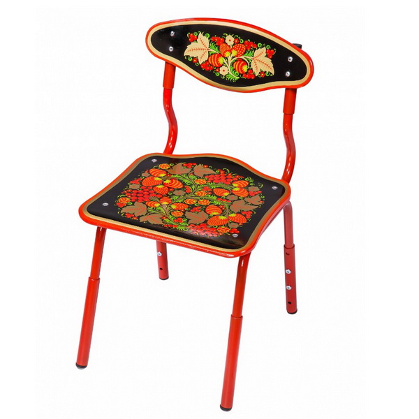 Стул детский "Дружок" 2-й ростовой категории на металлическом каркасе. Изготовлен в полном соответствии с традиционной хохломской технологией золочения. Имеет авторскую роспись в технике фонового письма. Роспись "Ягоды". Лаковое покрытие делает изделие влагозащищенным и износоустойчивым. Все применяемые при производстве материалы натуральны и экологичны.