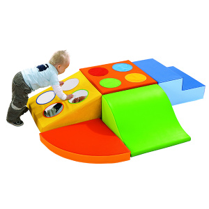 Разноцветный комплекс состоит из 5 травмобезопасных частей: включает горку, ступеньки, основание, угловой мат и блок с отражающими вставками. Модуль, таким образом, стимулирует двигательную активность и зрительное восприятие.