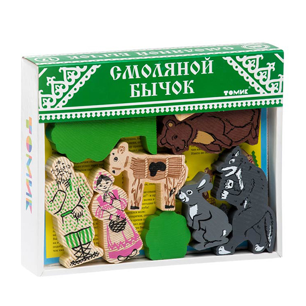 Состоит конструктор из 17 красочных элементов. Семь основных деталей - это герои сказки: смоляной бычок, дед, баба, внучка Танюша, заяц, серый волк и медведь. Остальные детали представляют собой детали домика и деревья. Все элементы изготовлены из экологически чистого дерева, краски не токсичные и прочные.