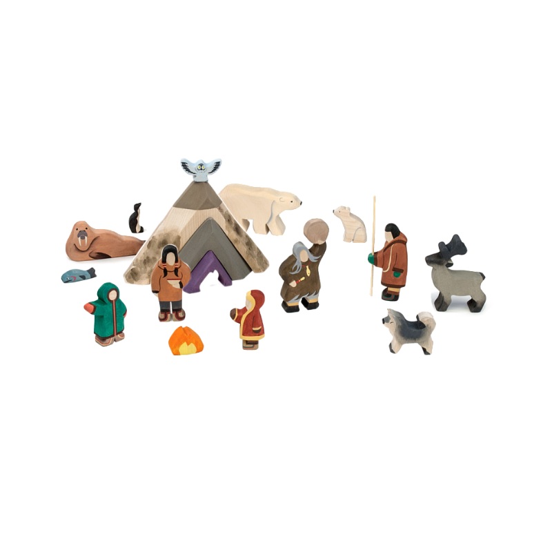 Игровой набор «Народы Севера» познакомит ребёнка с культурой и бытом народов, которые на протяжении многих веков проживают на Крайнем Севере – чукчей, эвенков, ненцев. В набор входит семья в традиционных костюмах, шаман и животные: олень, морж, кайра, белая медведица с медвежонком, полярная сова, рыба и сибирская хаски. А ещё, конечно, чум – такие жилища в форме шалаша удобно собирать, разбирать и перевозить, что очень удобно при кочевом образе жизни. «Сказки дерева» рекомендуют познакомиться с фольклором этих народов, почитать своим детям чукотские, ненецкие, эвенкийские народные сказки. С помощью набора «Народы Севера» можно проиграть множество сюжетов. Деревянные фигурки тщательно отшлифованы и расписаны вручную безопасными красками. Сертифицировано для детей от 3 лет.