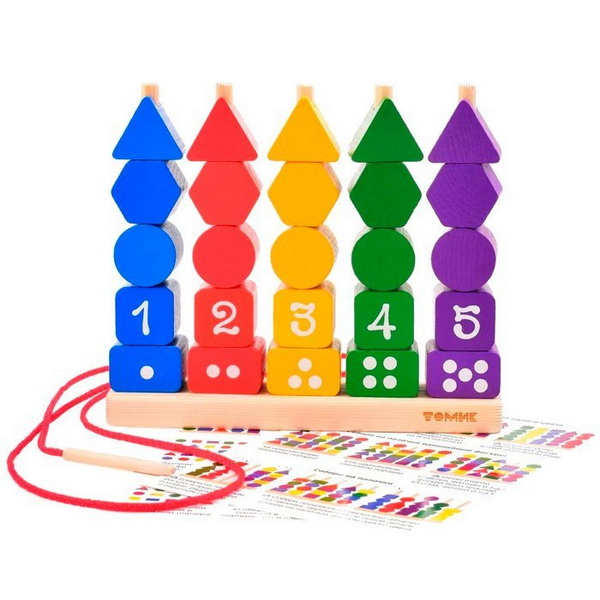 Деревянная игра сочетает в себе несколько вариантов: сортёр, обучение цветам, формам, счету, логические цепочки. В набор входят карточки, на которых представлены разные варианты игр. Цветные элементы достаточно крупные. Фигурная вырубка способствует развитию мелкой моторики у малышей.