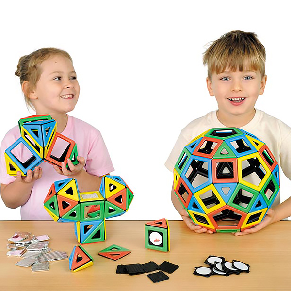 Большой конструктор из магнитных разноцветных деталей необычной формы, отлично подходит для классной проектной деятельности, творческого моделирования и изучения геометрических форм.
