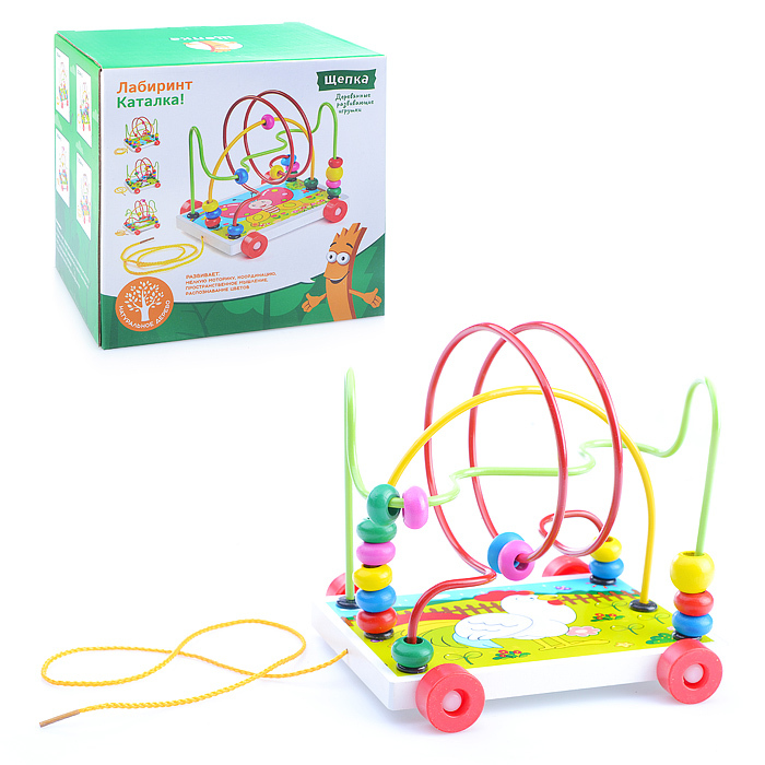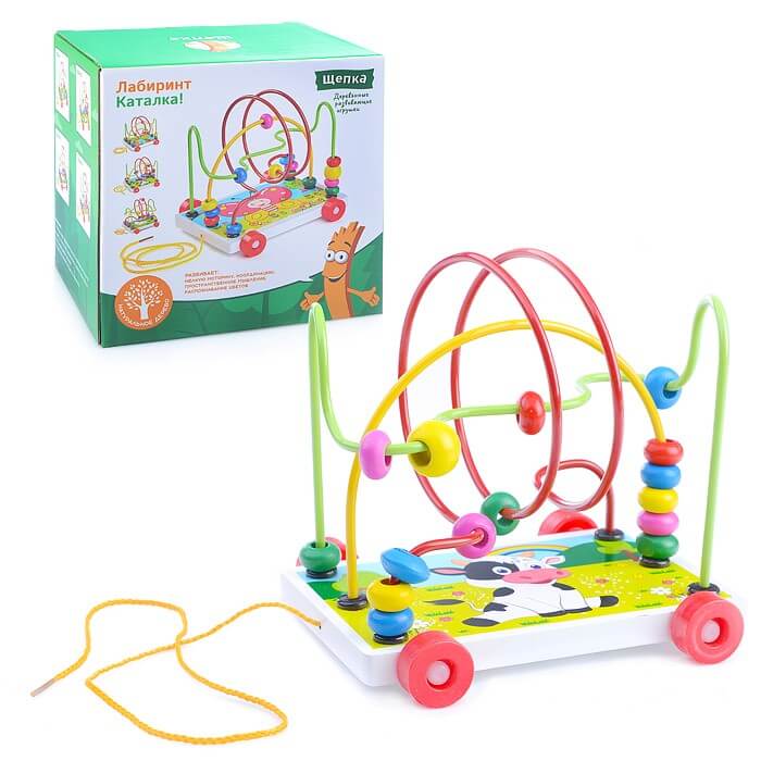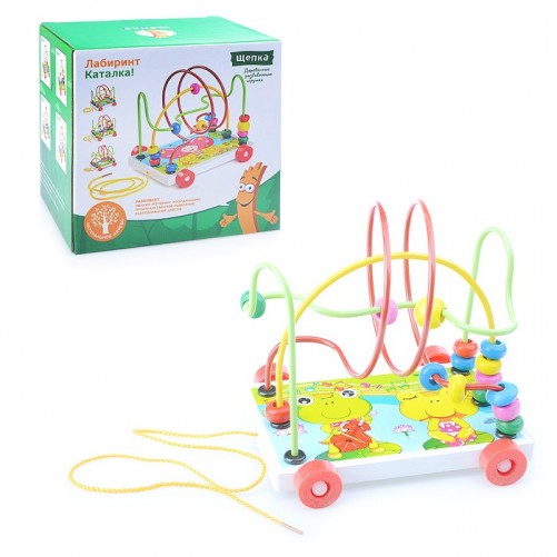 Металлический лабиринт на деревянной платформе с колёсами. На прутья лабиринта нанизаны деревянные бусины.
