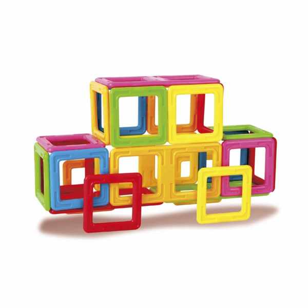 Оригинальный магнитный конструктор My First состоит из квадратов и треугольников трех цветов, сделанных из прочного непрозрачного пластика.