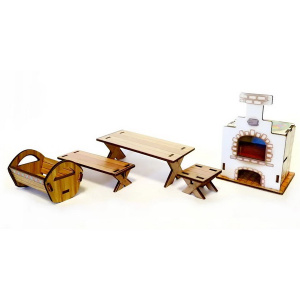 В набор входят: Печь - 1 шт., Колыбель - 1 шт. Стол - 1 шт., Скамья - 1 шт., Табурет - 1 шт. Описание для сборки - 1 шт.