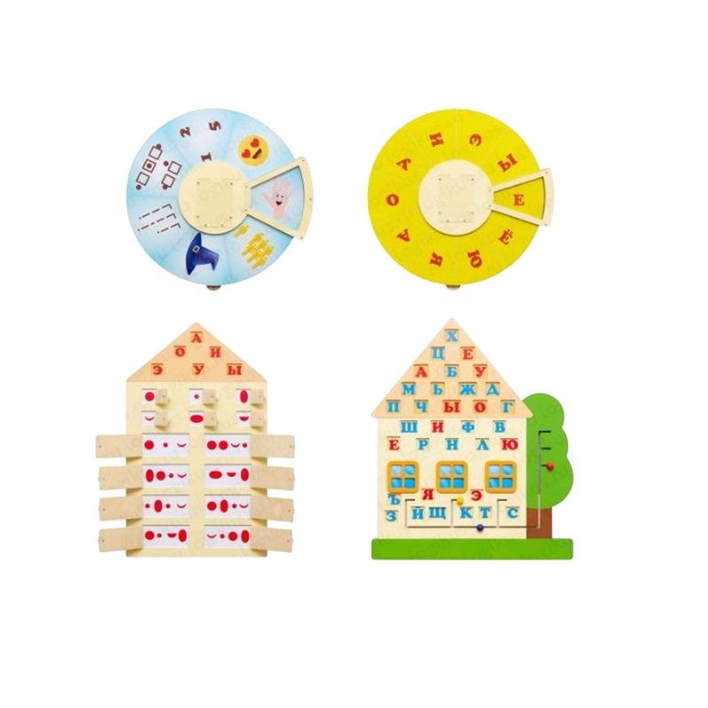 Размер: бизиборды-диски — 62 х 59 см, бизиборд «Дом со звуками» — 75 х 90 см, бизиборд «Звуковой анализ» — 60 х 100 см.