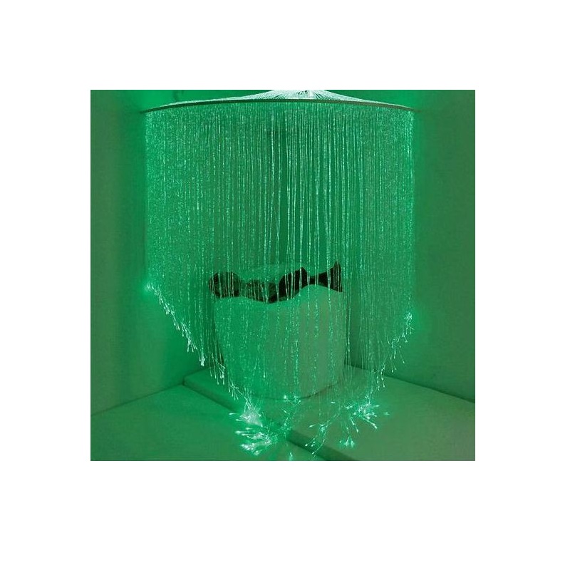 Фиброоптический угловой занавес используется для светового оформления углов в Сенсорной комнате или как дополнительный элемент над уголком с воздушно-пузырьковой колонной. Занавес помогает создать места уединения и релаксации, а также зонировать пространство. Козырек изготовлен из фанеры и поставляется с настенными креплениями. На него устанавливается профессиональный источник света со встроенным пучком фиброоптических волокон (200 шт по 200 см каждое). Смена цветов или яркости производится с помощью пульта дистанционного управления (идет в комплекте).
