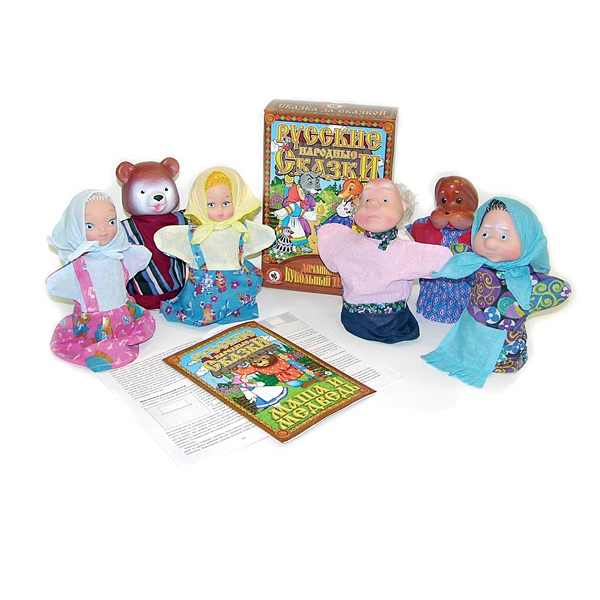 В комплекте: Дед, Бабка, Машенька, подружка, собачка, медведь, книжка в мягкой обложке – пособие для создания кукольного театра.