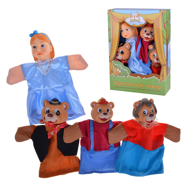 Набор кукол-перчаток для постановки детского спектакля по мотивам известной сказки "Три медведя". Все персонажи выполнены в ярких костюмах.