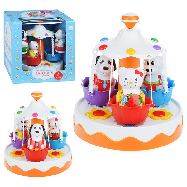 На карусели в сиденьях-цветочках под веселую музыку кружатся симпатичные зверюшки в нарядных костюмах. Фигурки легко вынимаются и могут участвовать в сюжетно-ролевых играх или в постановках домашнего кукольного театра.